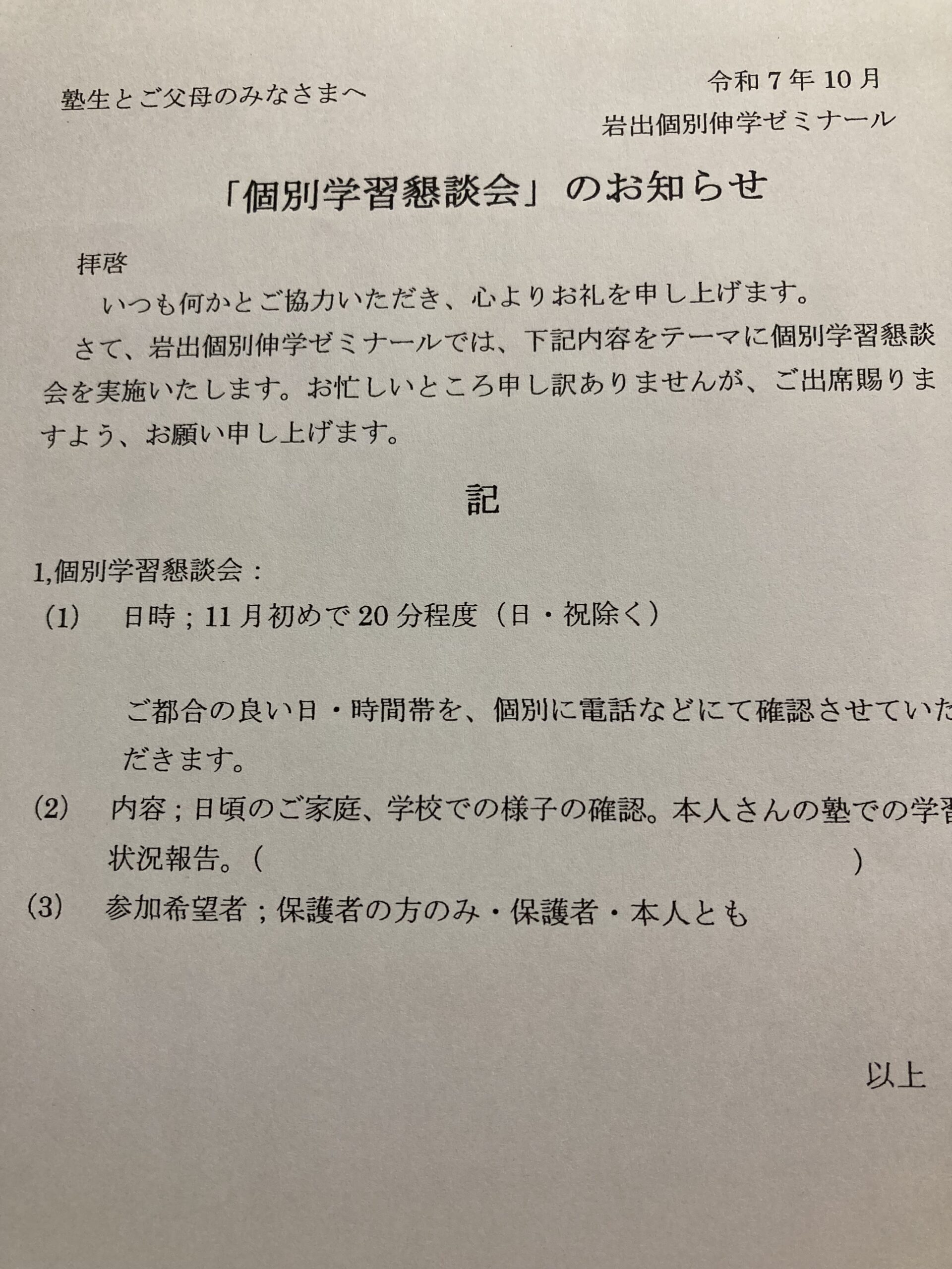21:00授業終了 月謝案内郵送 ㈮の到着予定 明日も15:00より授業。
