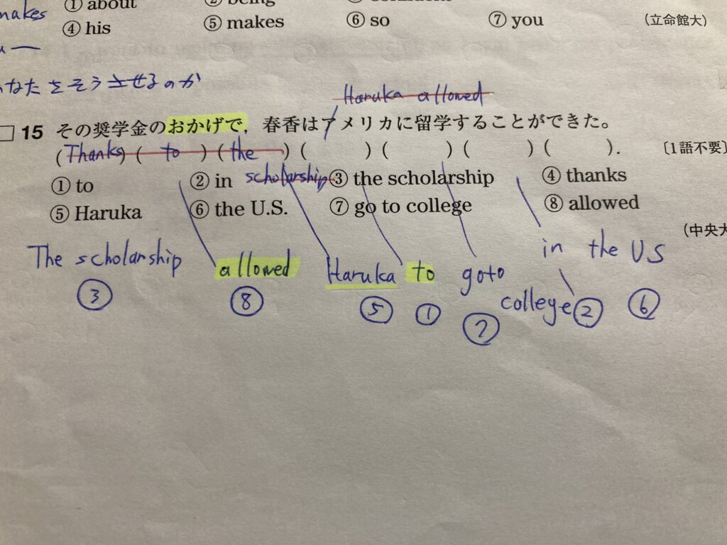 Thanksto ③the scholorship  ⑤Haruka ⑧allowed  の後 目的格が続かない…