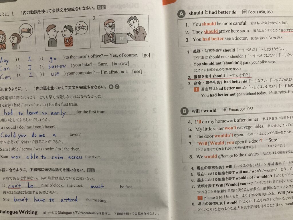 can’tは「できない」、shouldは「べき」という訳が基本だが…(写真は那賀高1生使用vizion questワーク助動詞より)