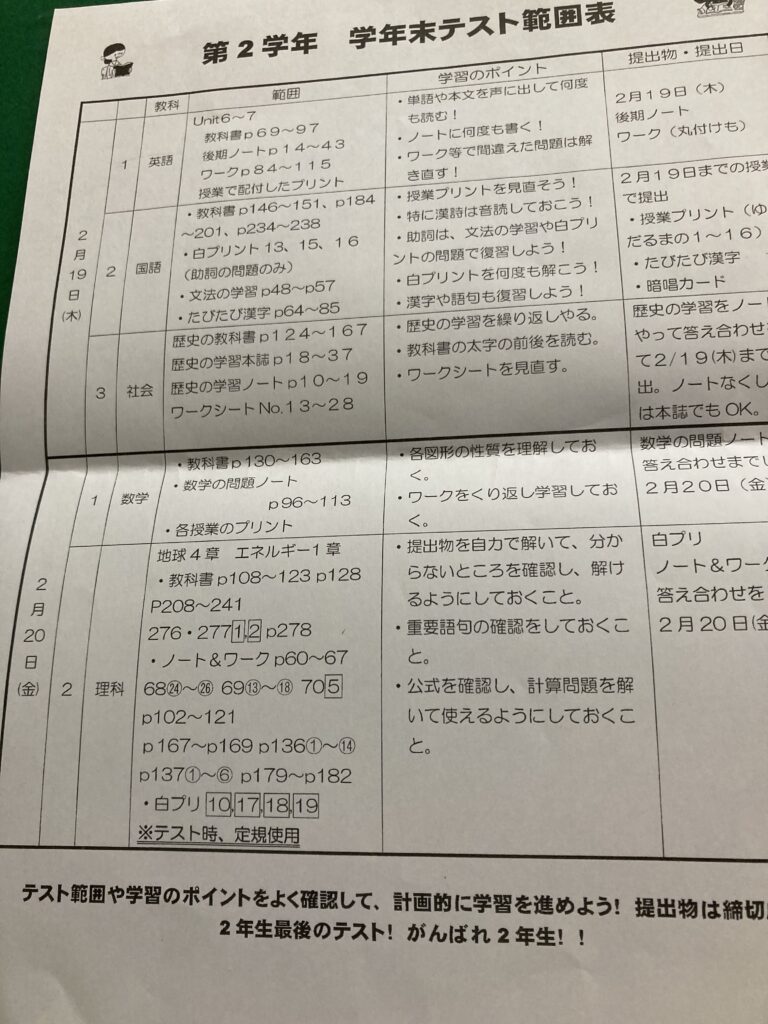 岩出中2生が学年末テスト対策範囲のプリントを忘れていきました。明日渡します。