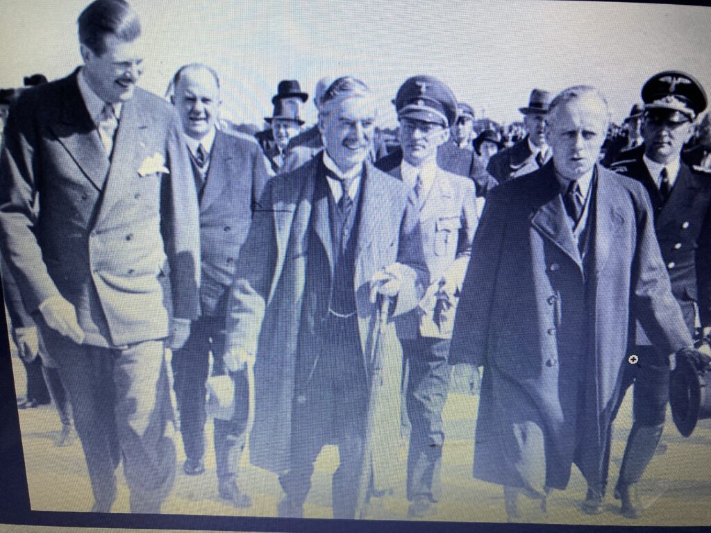 なお、チェンバレンどこへでも雨傘を携行する癖があったので「アンブレラマン」とあだ名された。彼のトレードマークの雨傘は宥和政策の象徴とみなされた。(写真:中央 雨傘を持ってドイツ外相と歩くチェンバレン)