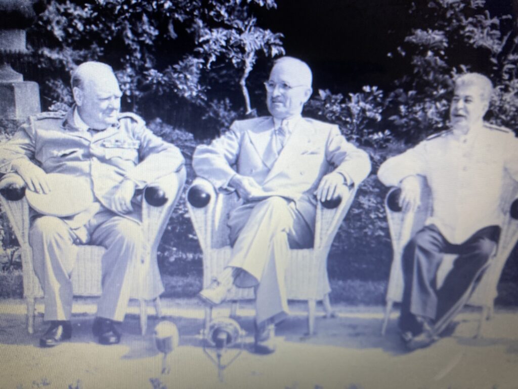 ポツダム宣言発表(1945年7月)→写真左より、:チャーチル :トルーマン :スターリン、がポツダムで会談し、ドイツ管理問題を協議するとともに、日本の降伏をもとめた。