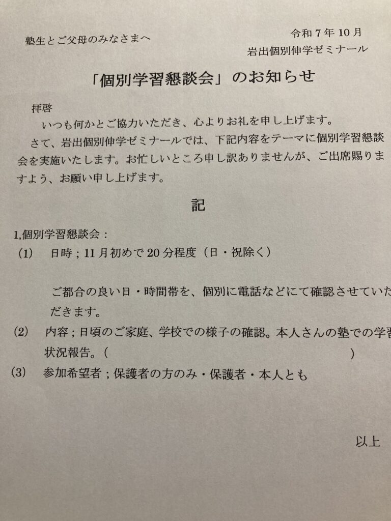 中3生11月前半に三者懇談を実施 11月月謝案内にご案内を同封(一部手渡し)します。来年度の公立高定員が10月末に発表予定なこと、25㈯実施の志望校判定テスト受験者は、結果が11/4㈫に出ることから4㈫の週に懇談をする予定 授業後に保護者の方入室してもらってしようと考えています
