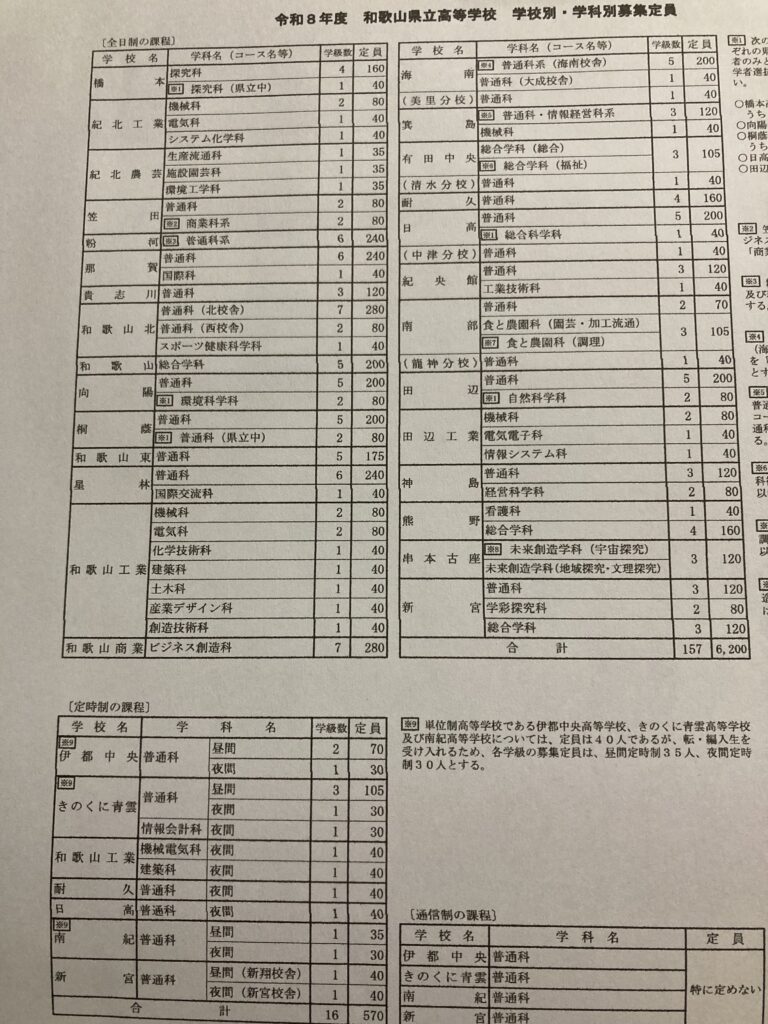来年度の和歌山公立高校募集定員が昨日、和歌山県教育委員会より発表されました。紀北地域では、紀北農芸は1クラス40人から35人に。きのくに青雲普通科(昼)が1名クラス増ぐらいで、他は昨年度と変わらず。現行の入試制度になった平成21年度以来、募集定員は過去最少(県全体で6,200人)