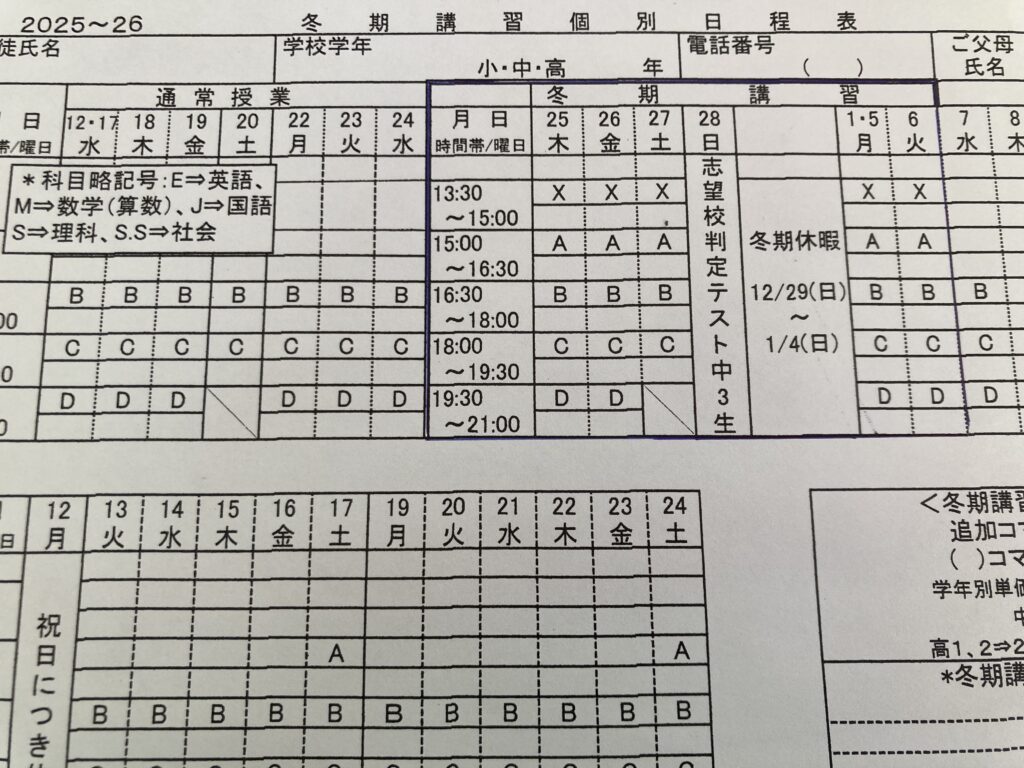 冬期講習日程表作成中 中3生、週3コマ受講生、高校生中心に考えています