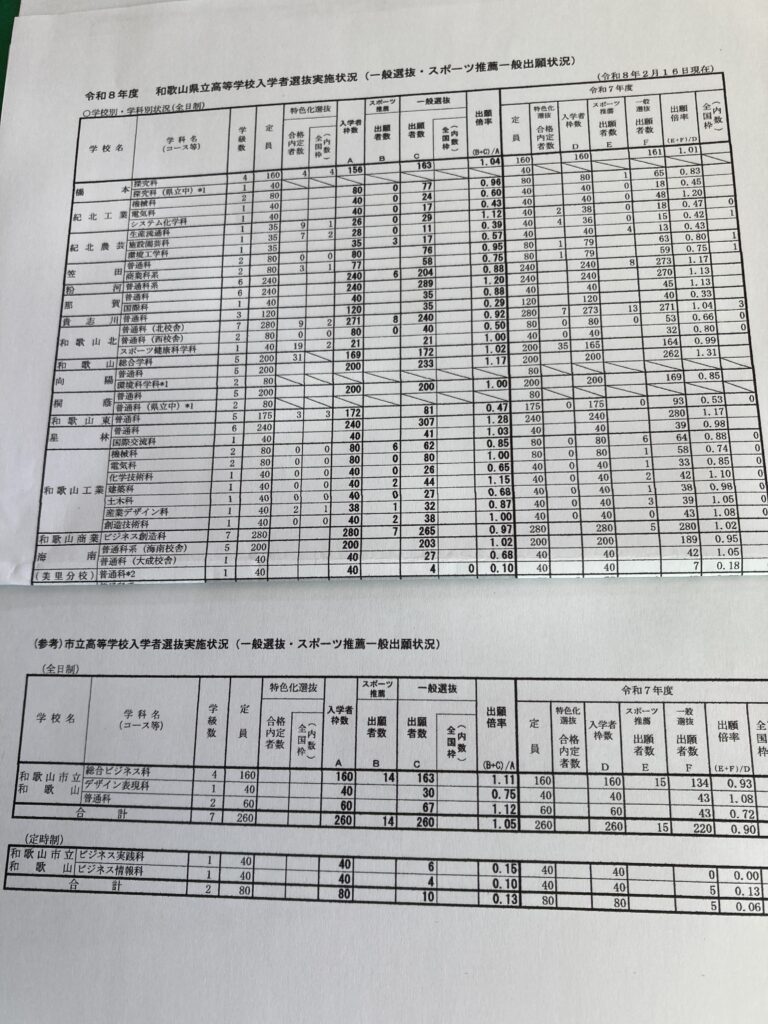 和歌山公立高入試出願状況が午後に発表されました。那賀高は普通科289人出願(定員240名)で49人オーバー 国際科が35人出願(定員40名)で5名まわし合格になるとしても、44人オーバー。