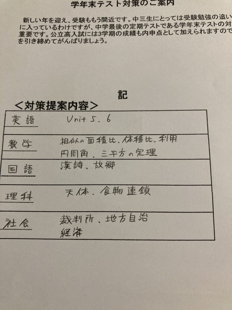 1月は中3生高3生が学年末テストあり。日程は以下の通り