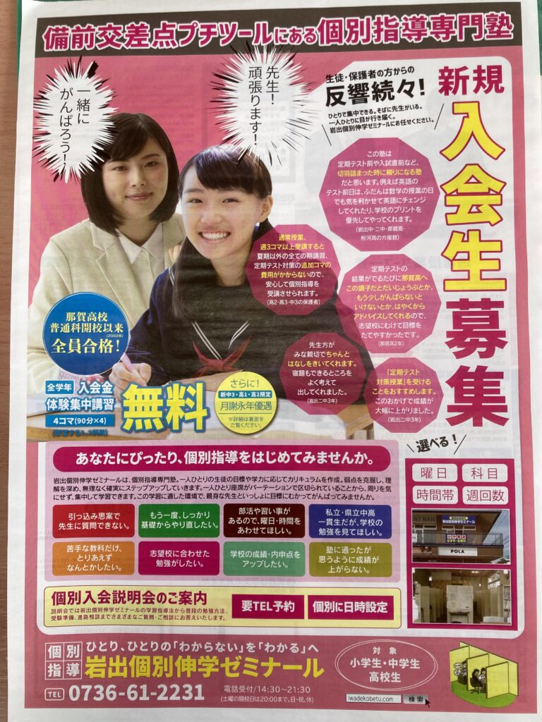新年度生募集チラシを来週㈭に和歌山リビングに折り込んでもらう予定にしています。まいなぁがなどでの告知も継続中 チラシ内容は今までとほぼ同じで、外観デザインは3年連続同じになっています。
