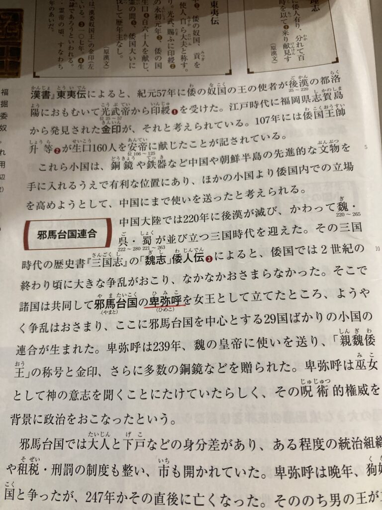邪馬台国の女王→「魏志」倭人伝 テストに出る史料文は→倭人は帯方の東南大海の中に在り…邪馬台国に至る…倭国乱れ、相攻伐して年をへたり。乃ち一女子を立てて王と為す。名を卑弥呼という。鬼道を事とし、能く衆を惑はす *帯方→楽浪(朝鮮半島)の南半を設けた郡 *鬼道→呪術