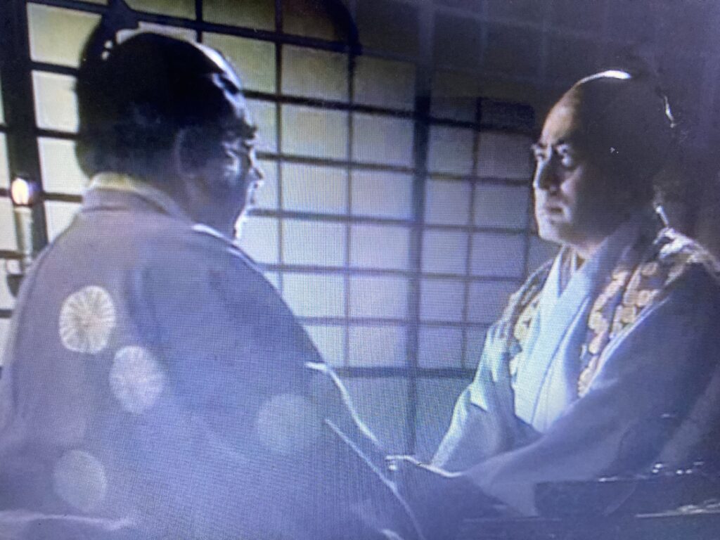 1586年10月26日、翌日の大坂城での秀吉との会見前日に豊臣秀長(秀吉の弟)邸に宿泊 その時、秀吉が現れ、家康に会見で頭を下げてほしいと請い願う(写真は大河ドラマ独眼竜政宗より:左が豊臣秀吉(勝新太郎):右は徳川家康(津川雅彦))
