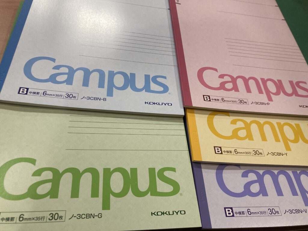 主に英単語チェックテストで満点だと満点カード(2点)8割以上だと合格カード(1点)貰え、カードがたまっていくと商品と交換できる。写真の5色ノートの1冊→カード30点で交換できる カード120点→図書カード(1000円)は到達できない生徒が多く敷居が高いが、30点→ノートは達成しやすい目標にはなると思う。