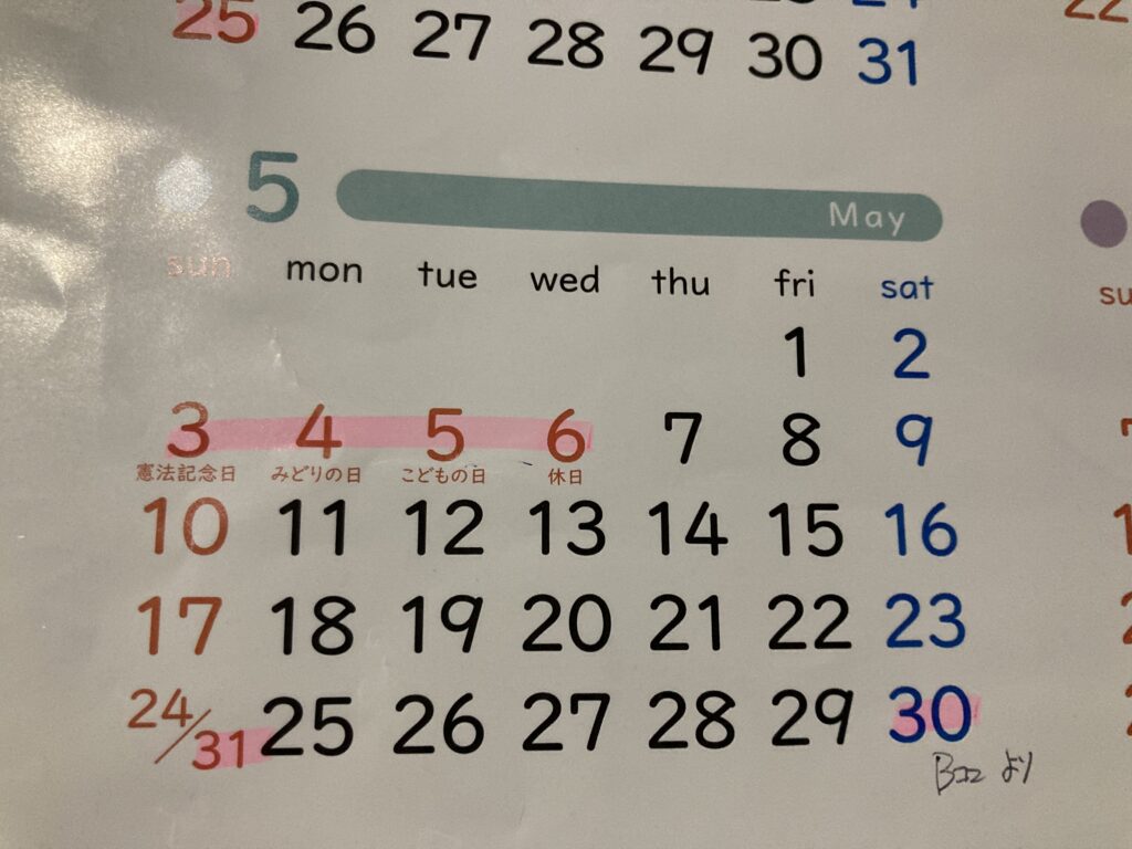5月休校日 6日までの祝日は休 30㈯は大腸内視鏡検査入院が午後から入っており、できれば休みにしたいが、二中2生の振替が入る場合は、Bコマからなら実施できるかと思う。